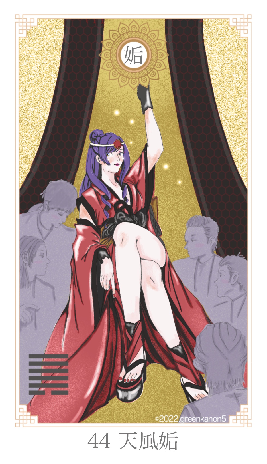 この卦(か)が出た時は、偶然の出会い、会う、美しい、美女、思いがけない、誘惑、悪女、玉の輿、巡り会い、女難、愛人、などの意味があります